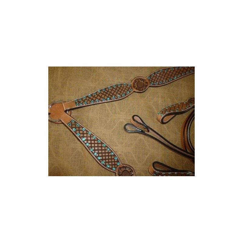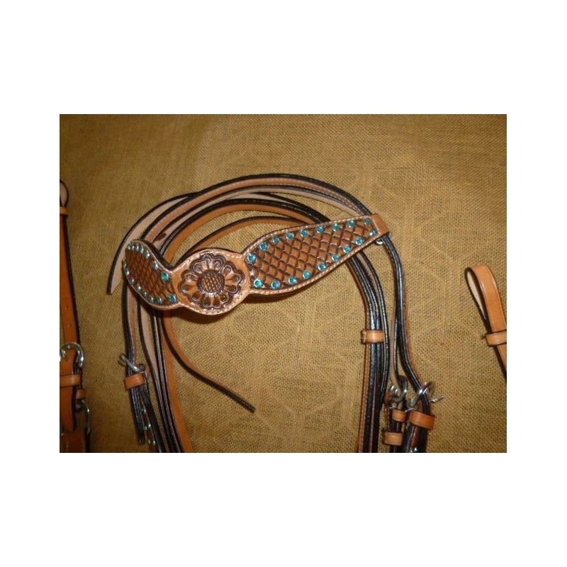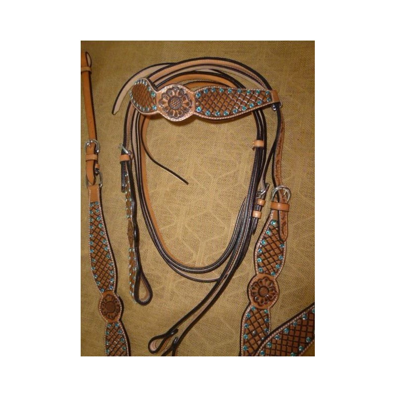 A lovely show bridle featuring chestnut antique-look leather, flower detailing and blue jewels. It comes with the bridle and matching reins. Full size only.